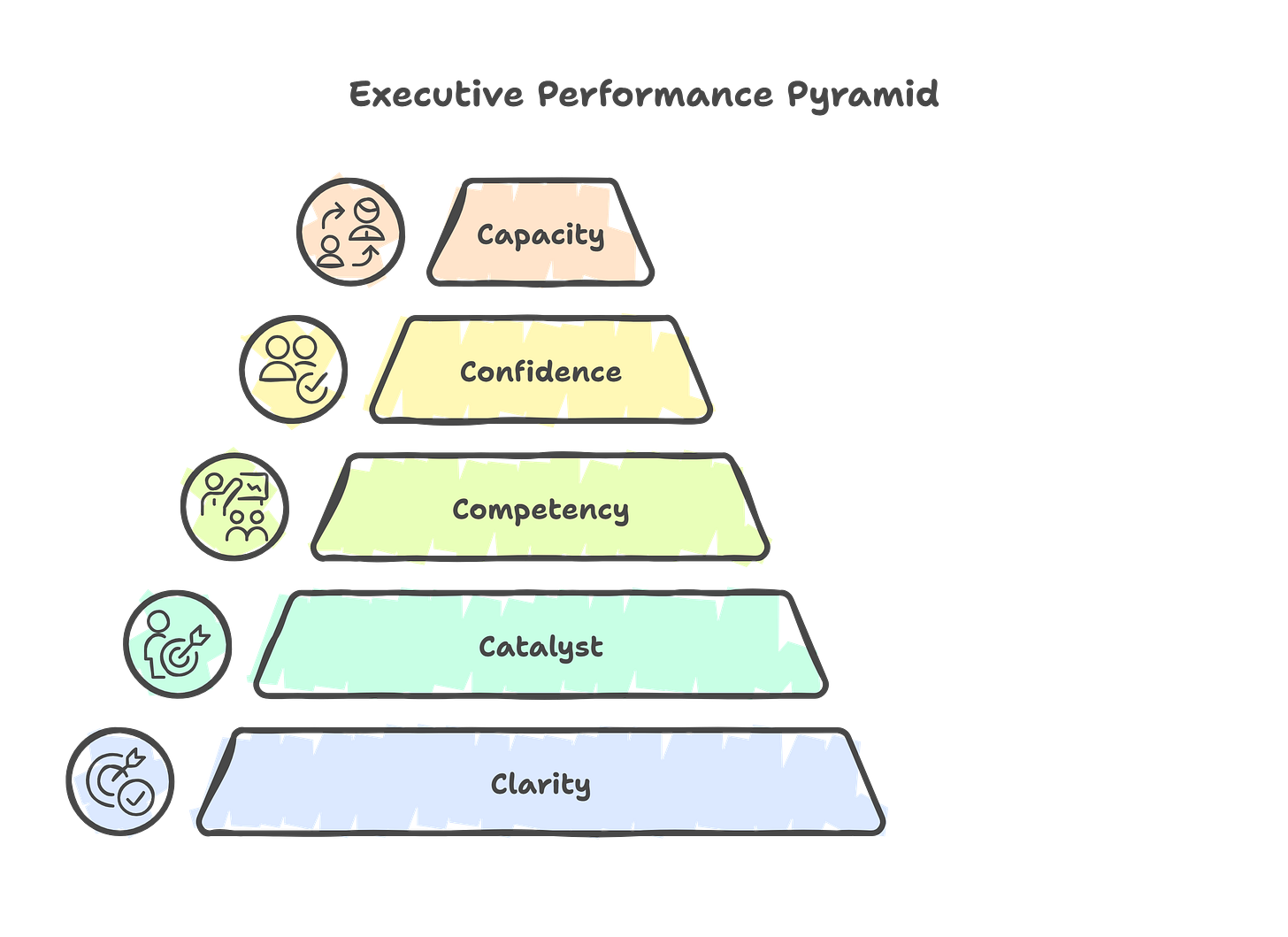 The power of treating Executive Performance as five distinct levers is that it makes interventions specific. Instead of vague coaching or general team-building, you can be surgical: tighten objectives for clarity, rework incentives for catalyst, map capability for competency, create confidence-building experiments, or rebalance workload to restore capacity.